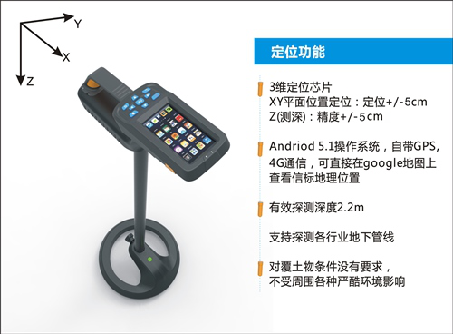 该定位仪性能稳定,操作简单,预装目前最流行的Android操作系统,便于客户二次开发,可广泛应用于电力、通信、煤气等地下管线的定位标识和数字化管理。