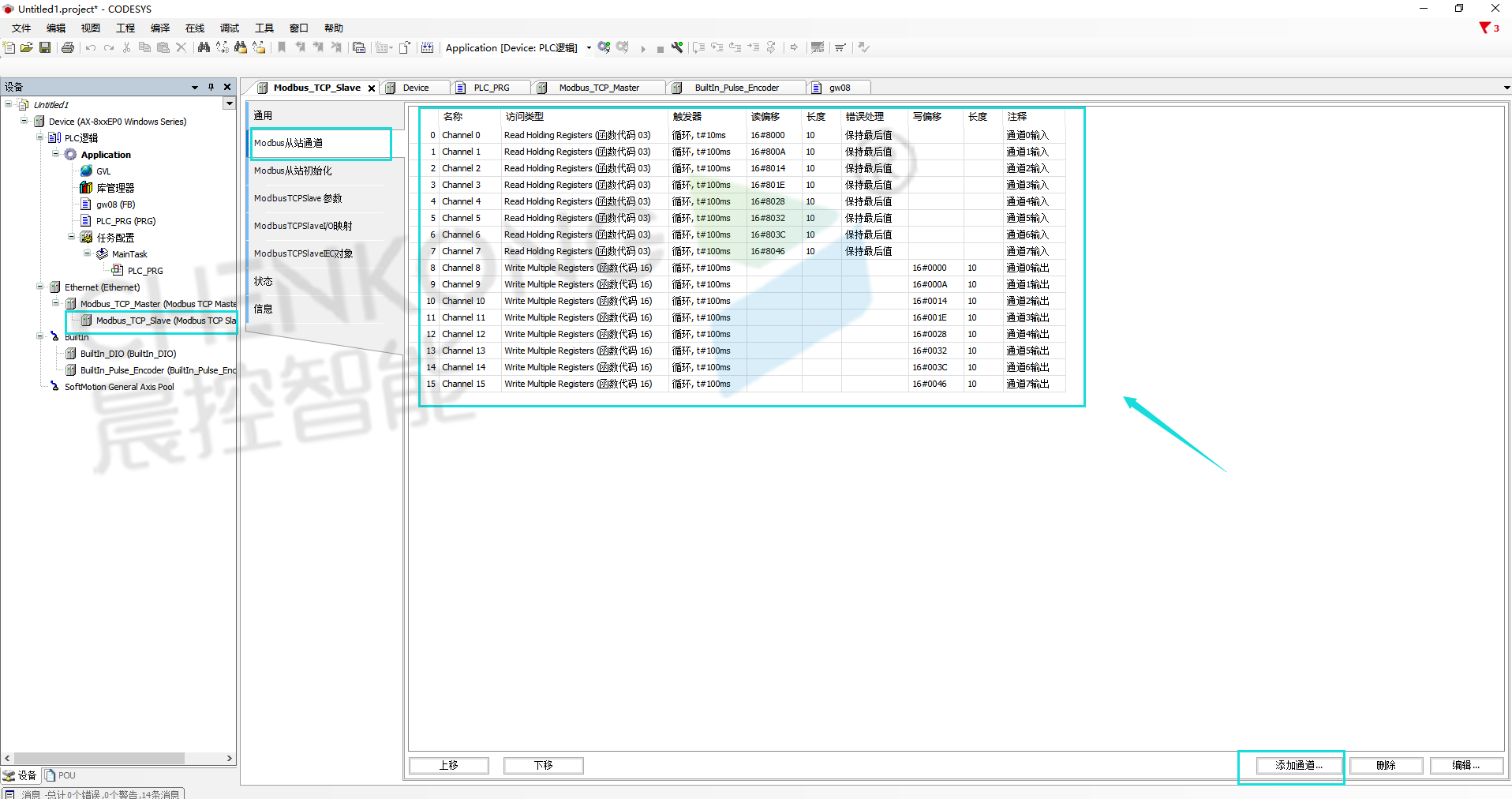 9、点击Modbus从站通道,点击添加通道(以下图为例:网关GW08一共有8个通道,每个通道有一共输入输出,输入输出分别各添加8个)
