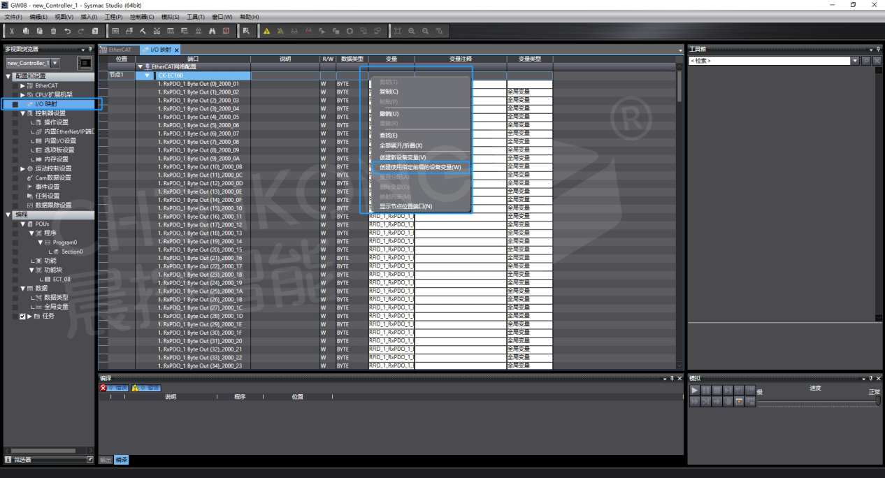 8、点击IO映射,打开刚刚添加的设备映射数据,右键选择”创建使用指定前缀的设备变量”。
