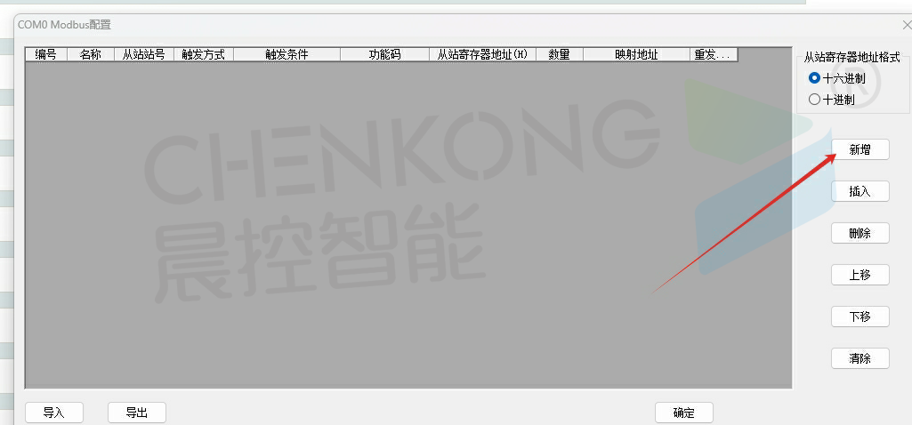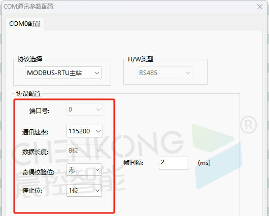 4、协议选择MODBUS-RTU主站,通信速率、奇偶校验位、停止位配置要与读写器一致,可以使用晨控的配置软件查看读写器配置,配置完成后点击确定