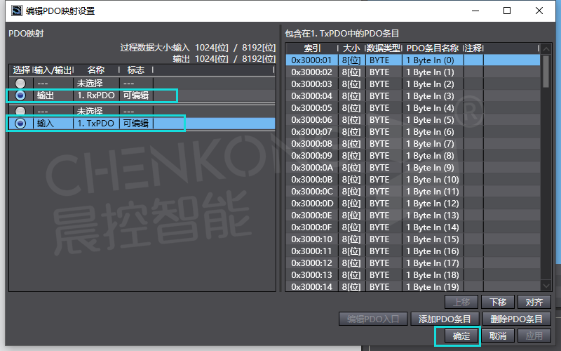 5、添加完成后,在右边工具栏中选择刚刚添加设备文件,双击添加,添加后点击设备右边打开编辑PDO映射设置。