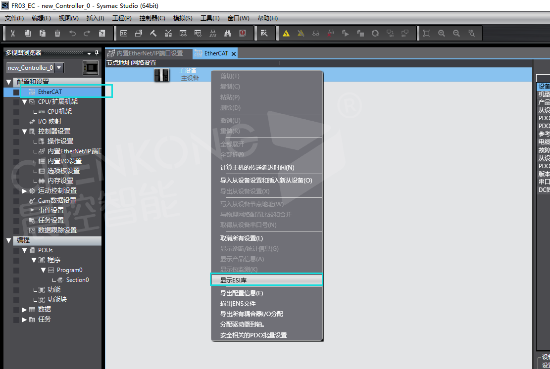 3、点击EtherCAT,右键主设备,显示ESI库
