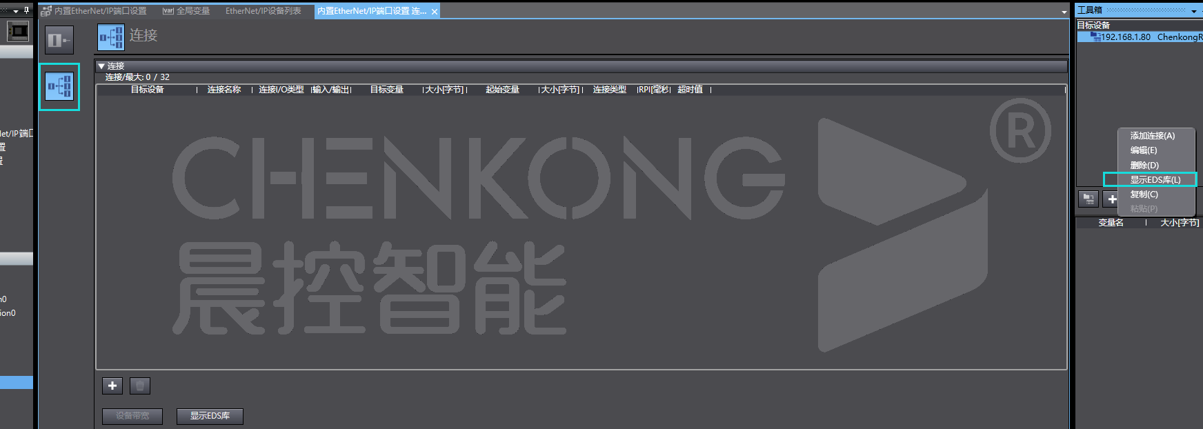 6、点击连接,右键工具箱的目标设备空白处,选择显示EDS库