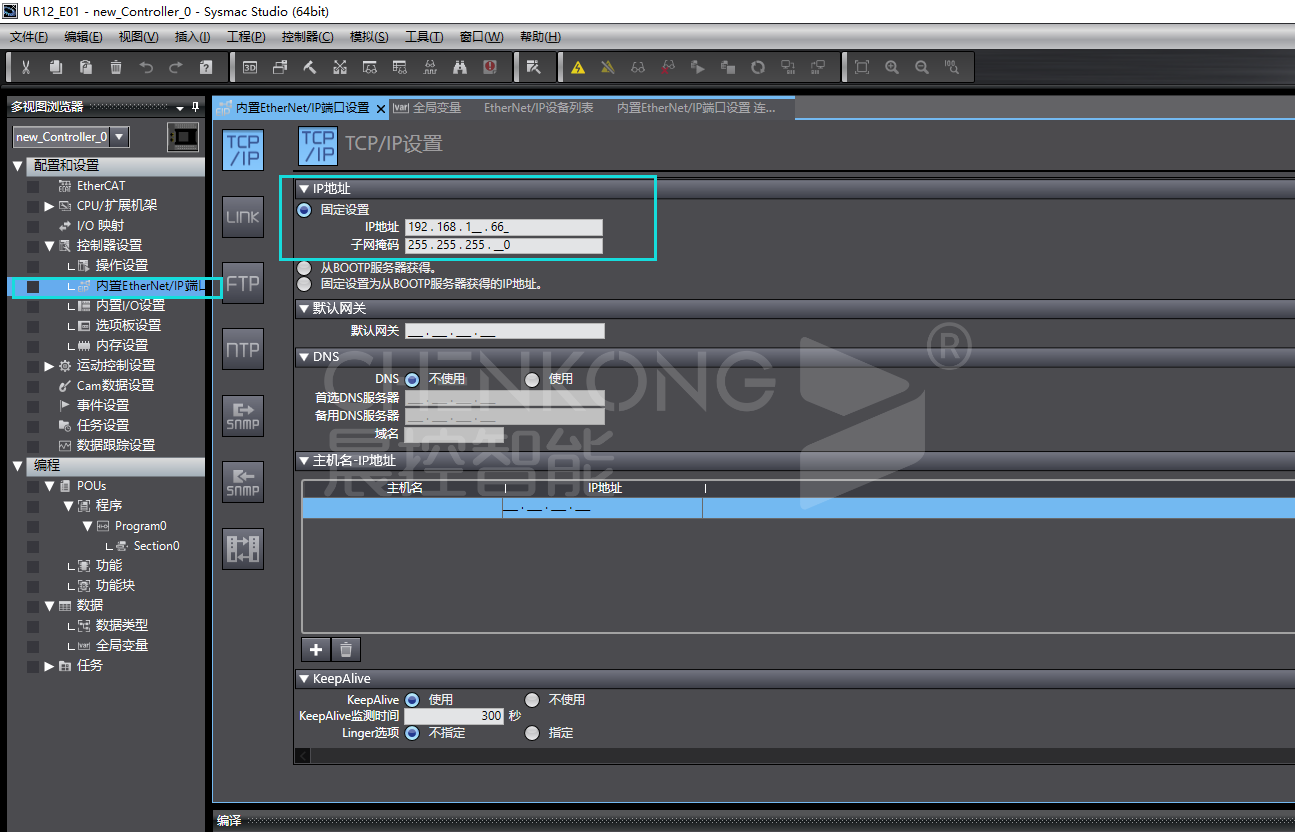 1、点击配置IO设置中的控制器设置,进入内置EtherNet/IP端口,设置PLCip(当前PLCip为192.168.1.66为例)