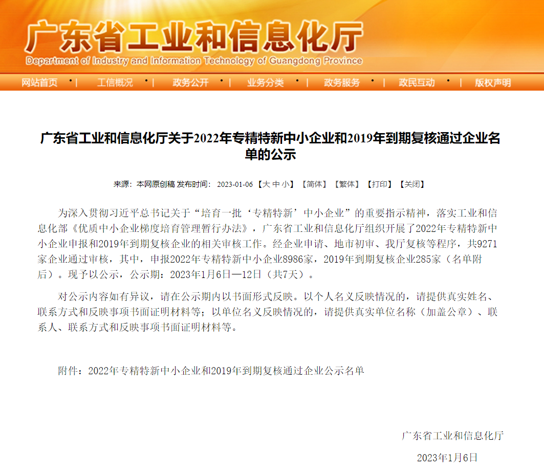 日前,广东省工业和信息化厅公布了2022年度“专精特新”中小企业。