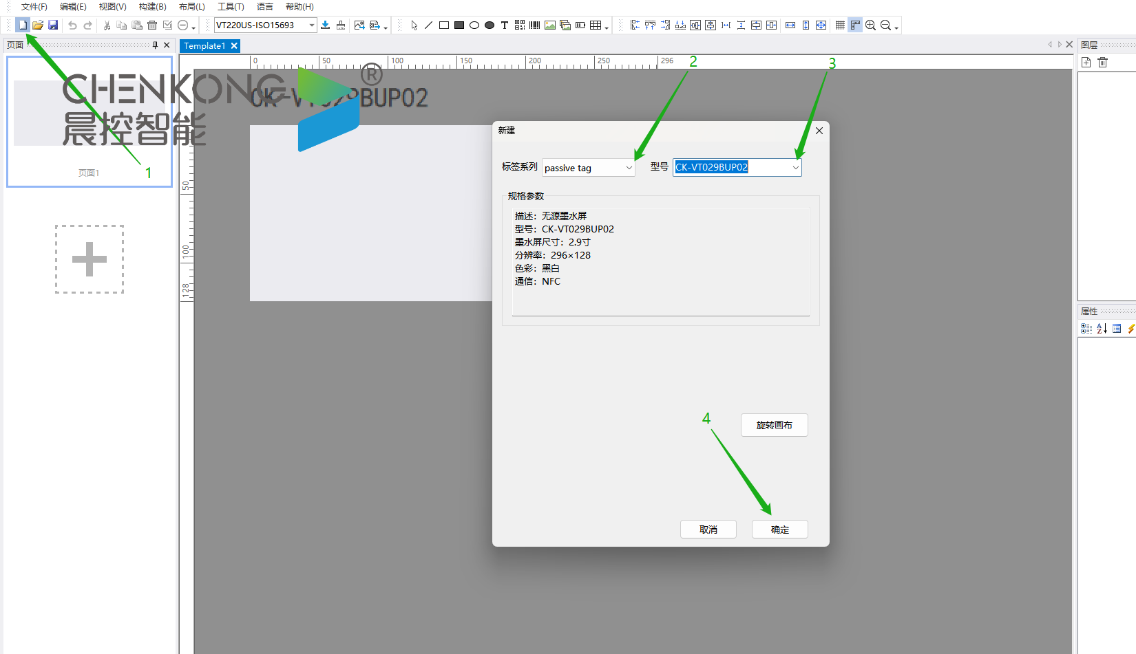 (1)CK-VT220US连接到电脑,打开Visual Tag Designer软件,新建电子纸模板。以CK-VTO29BUP02电子纸为例,新建模板型号选择CK-VTO29BUP02