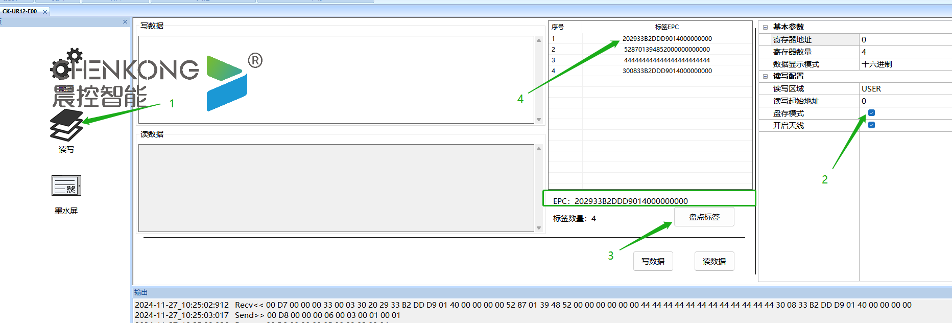 (2)自动连接到读写器后,先点击读写,进入读写页面。第二步开启读写器的盘存模式,第三步点击盘存标签,此刻标签列表里会出现电子纸右下角号码一样的标签EPC,点击选择代表电子纸的标签EPC号,这样就可以对电子纸进行改写操作了。