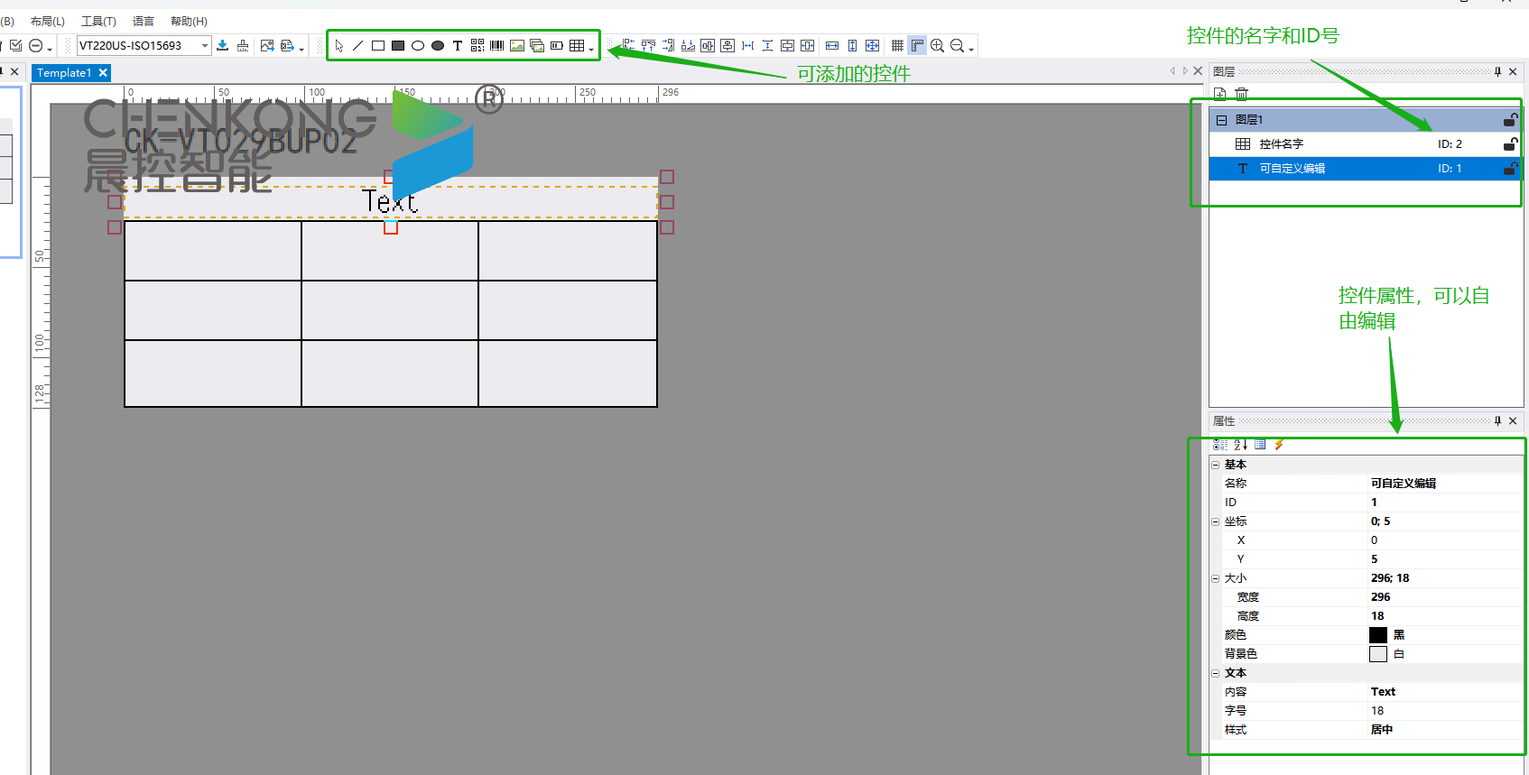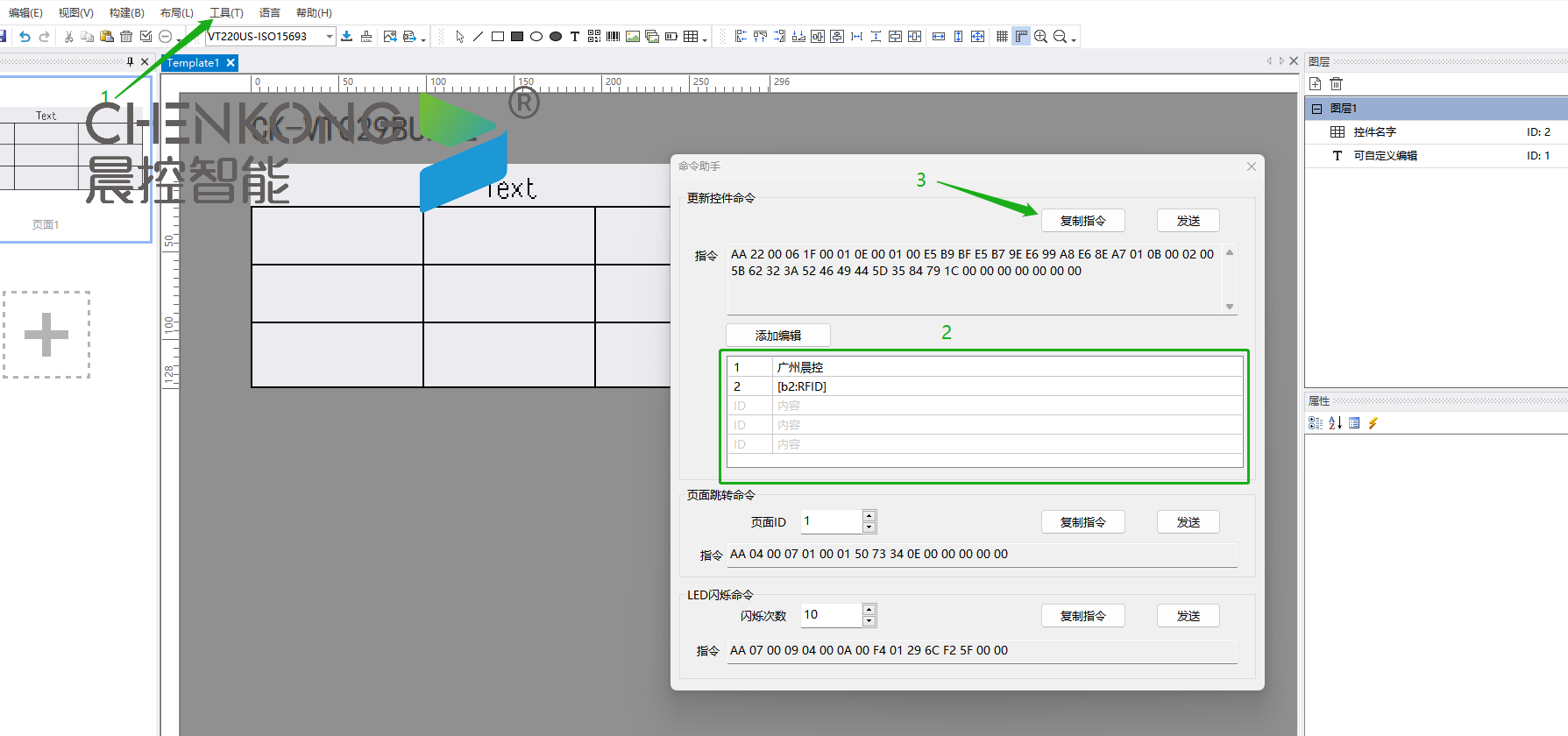 (3)现在进行电子纸显示内容修改,刚才下载的模板里创建了一个文字控件,ID为1。一个表格控件,ID为2。为了更方便发指令修改显示内容,需要借助墨水屏组态软件Visual Tag Designer,自动生成的我们需要的指令。