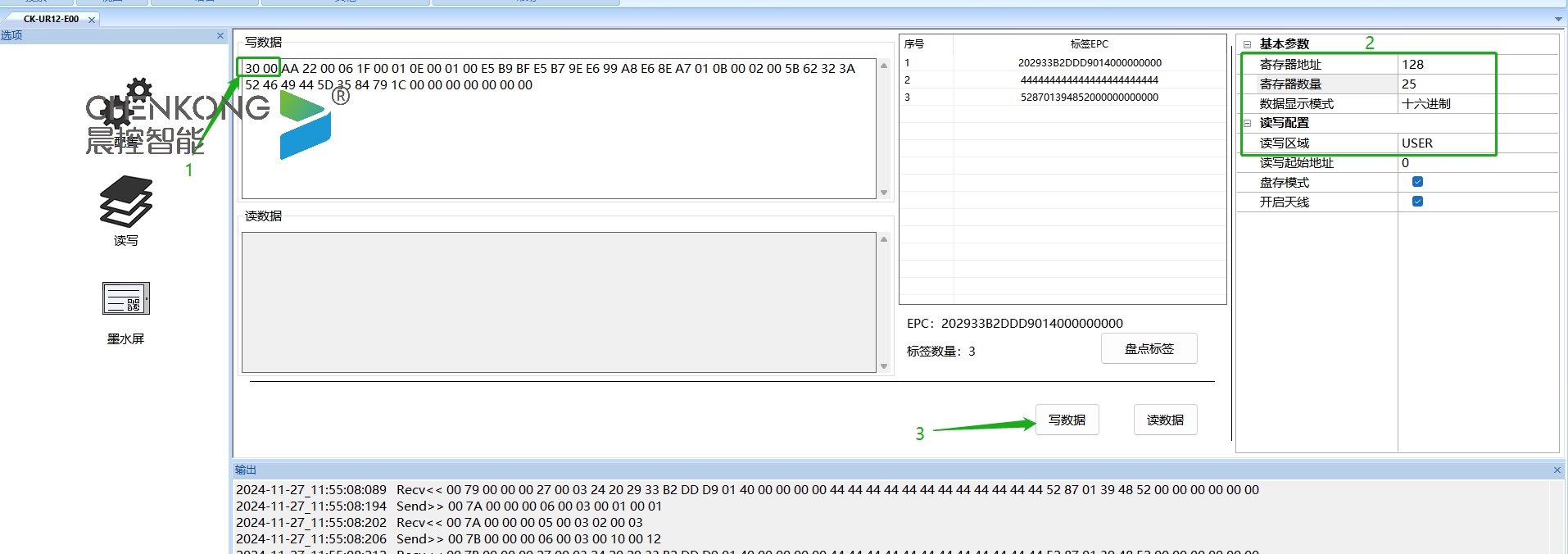 注:CK-UR12-E00读写器一次最大写入字节为64个字节,不同读写器会有差异,可以按实际情况写入