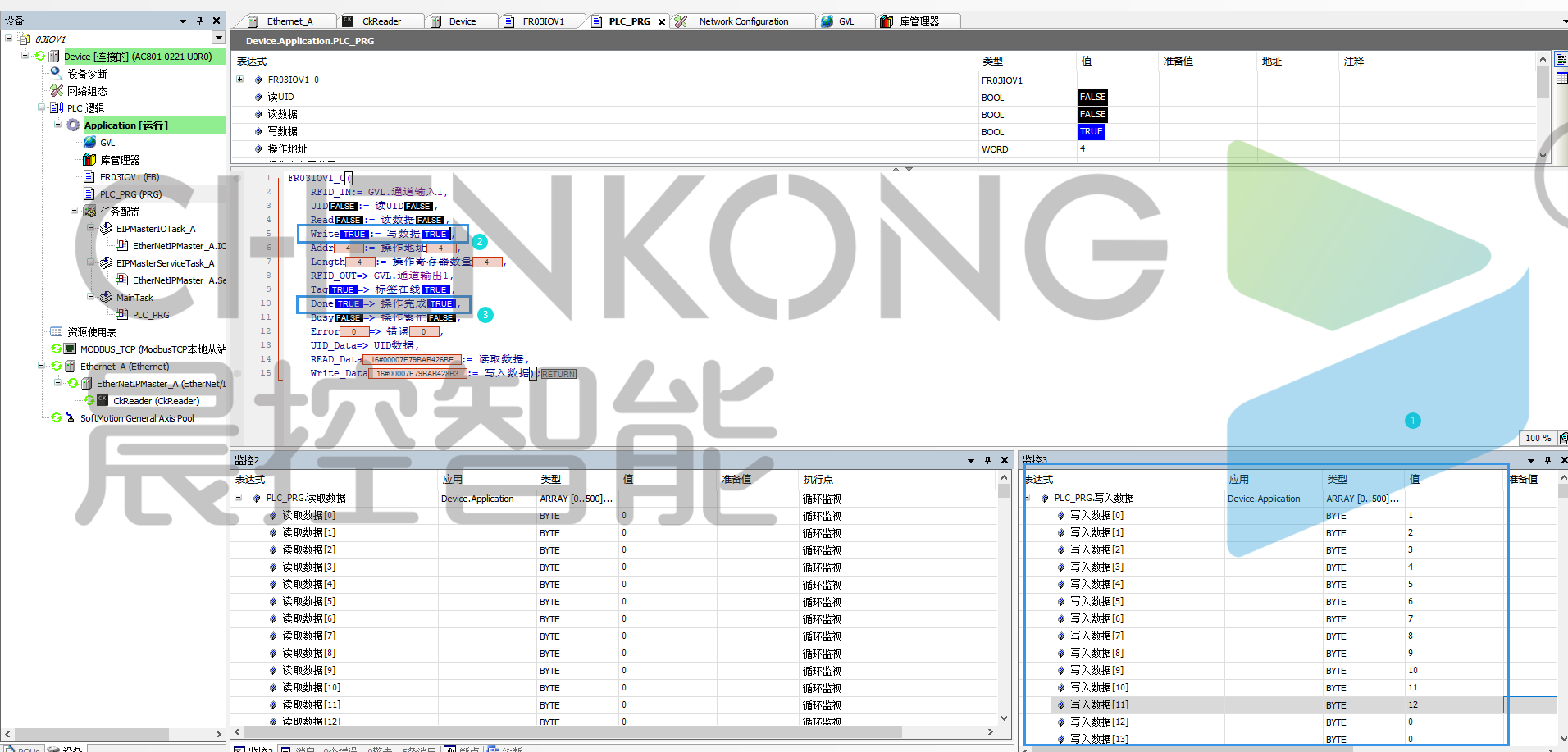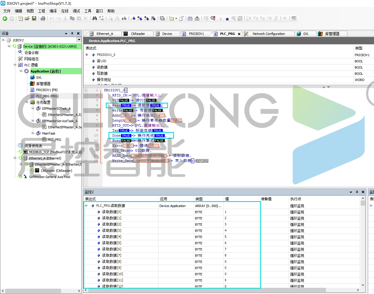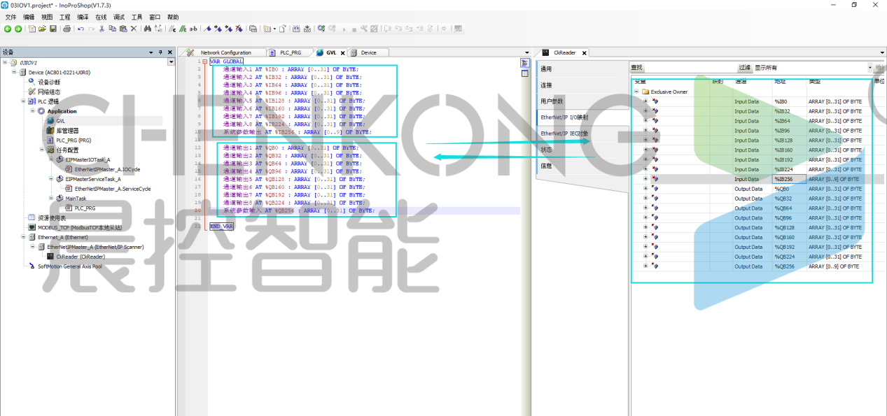 在全局变量中创建18个数组,分别为读写器的输入9个,读写器的输出9个,长度跟上方映射长度一样,然后引用设备映射内存分配中的IQ地址。
