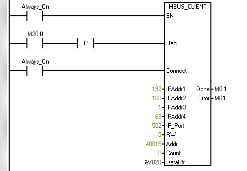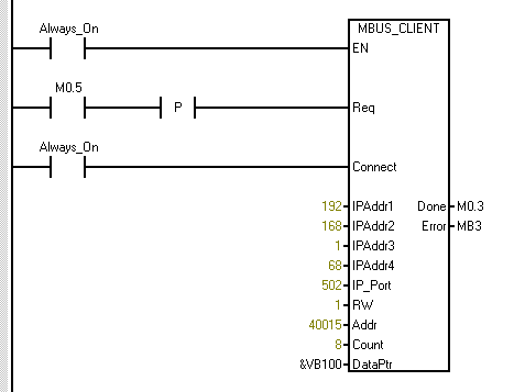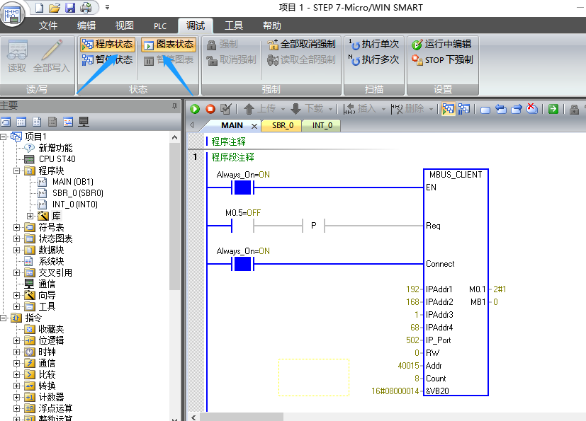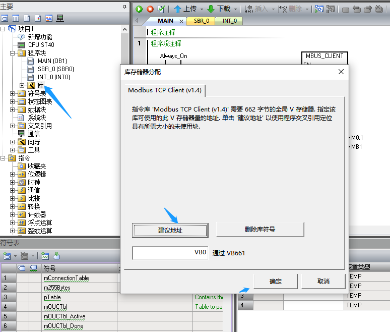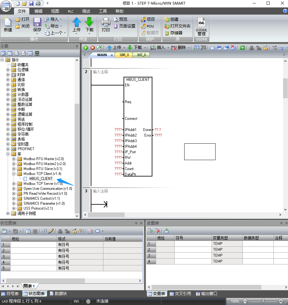 1、新建工程,在主要窗口找到库-modbus tcp client(v1.4),双击mbus-client后显示程序块。