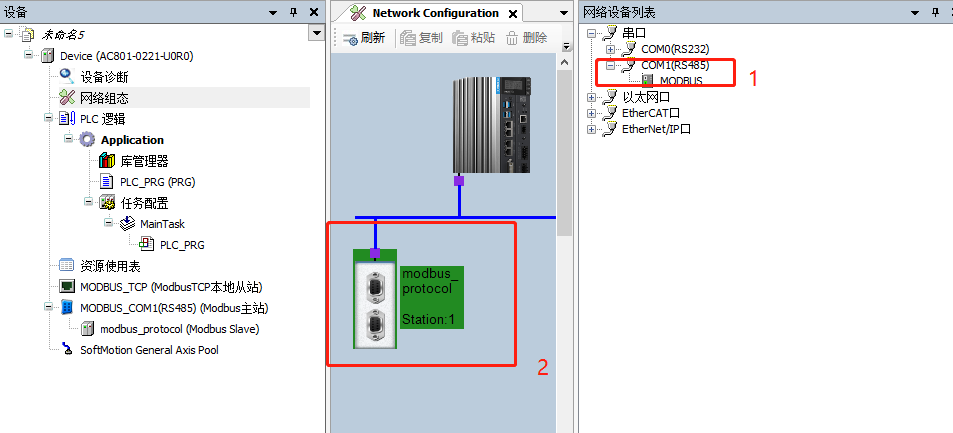 2、点击网络组态在网络设备列表找到RS485双击
