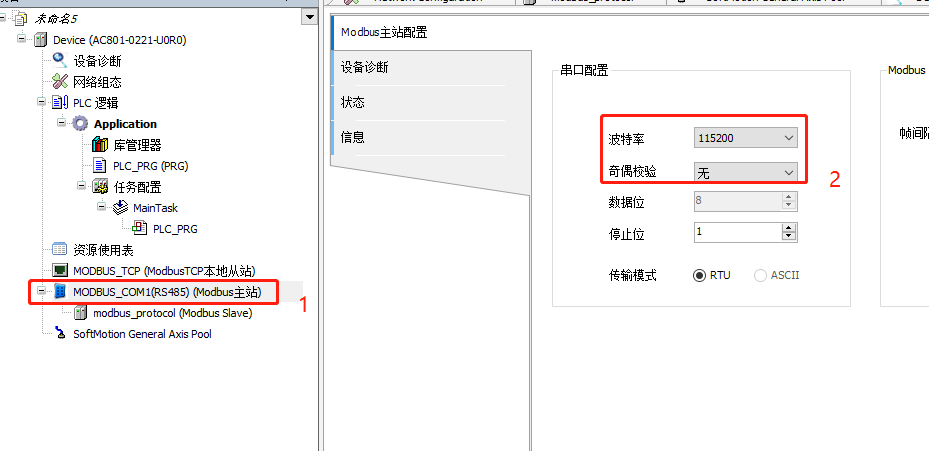 3、点击modbus-com1(rs485)后对参数进行修改如下图