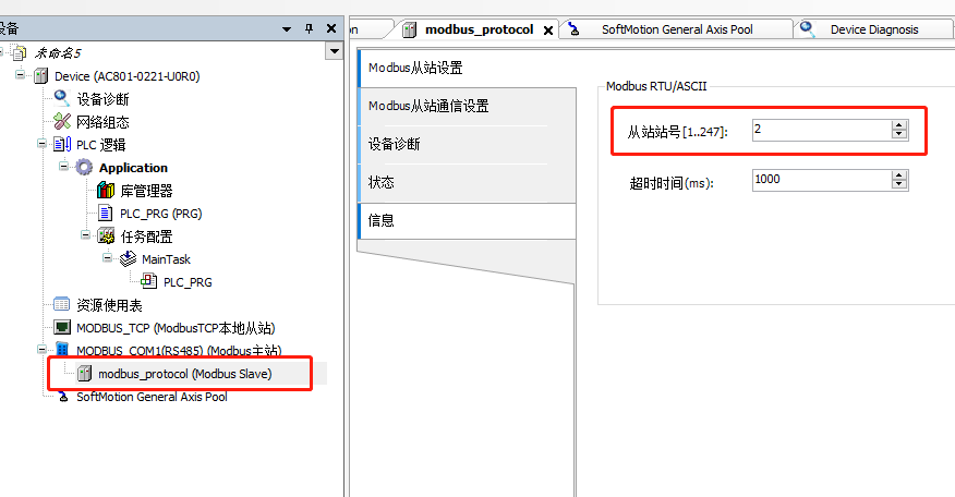 4、点击modbus-protocol(modbusslave),修改从站站号