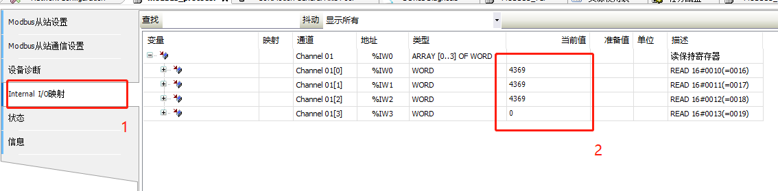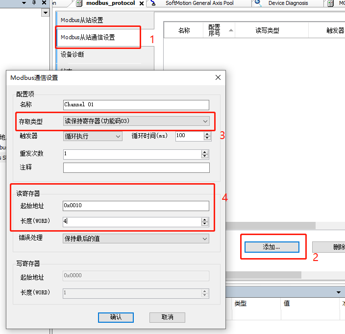 5、在modbus从站通讯设置点击添加后如图所示(起始地址这里选择0x0010,长度为4)