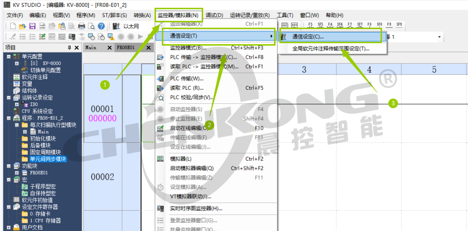 2在“监控器/模拟器”->“通信设定”->“通信设定”,打开通信设定
