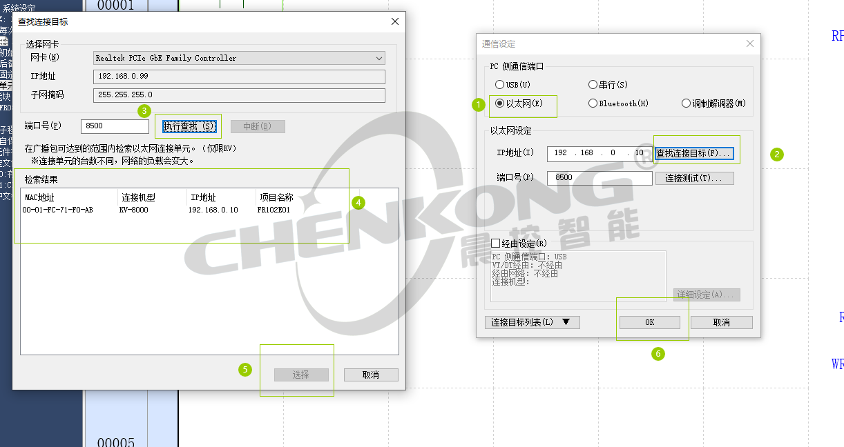 3在通信设定中配置对应自己的PLC,这里以“以太网”IP地址192.168.0.10,为例:先在pc侧通信端口选择“以太网”,点击查找连接目标,后在查找连接目标页面中点击执行查找,等待搜索出所使用的plc后,点击plc,再点击“选择”,后点击“OK”,完成配置