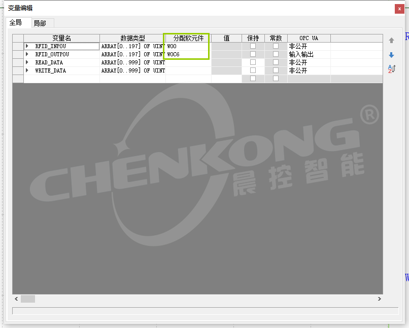 10在“变量”->“全局”创建两个对应映射的输入输出数组,输入分配软元件为“W00”,输入分配软元件为“W0C6”。下载程序完成配置