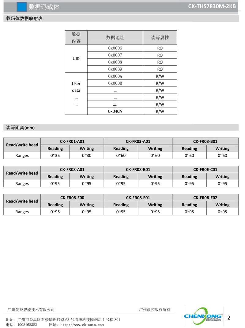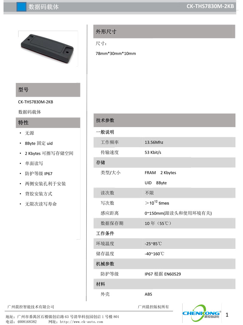 大容量高频方形载码体CK-THS7830M-2KB,工作频率:13.56Mhz,传输速度:53 Kbit/s,感应距离:0~150mm(跟读头和使用环境有关),尺寸:78mm*30mm*10mm,背胶安装方式,无限次读写寿命。